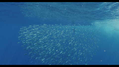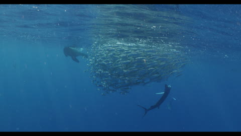 Striped Marlins and a Sea Lion Cirlce a Baitball